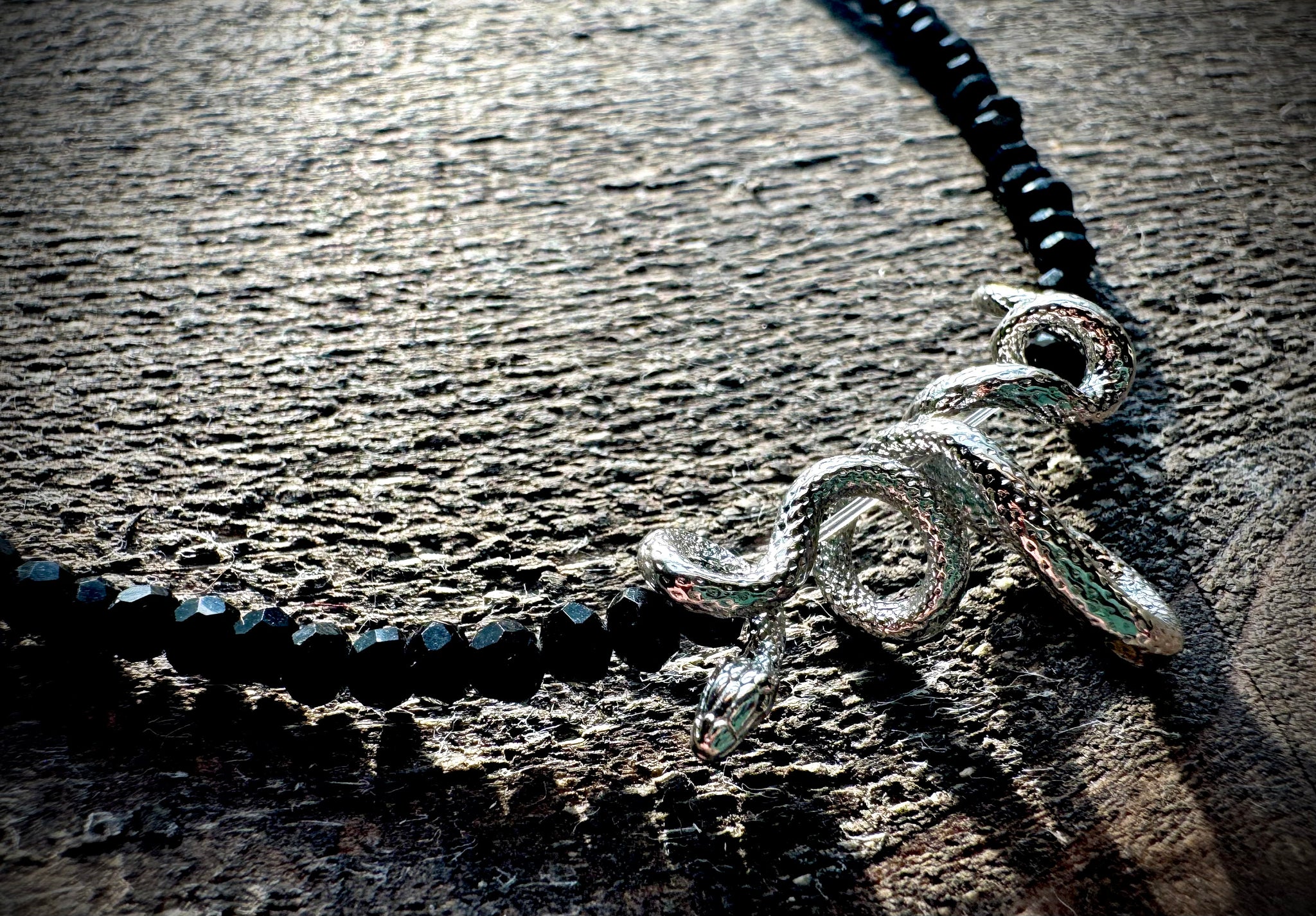 The center silver snake looks like it’s floating in the middle of the necklace, giving a really cool illusion. The main stone beads are faceted cut black Onyx stones.