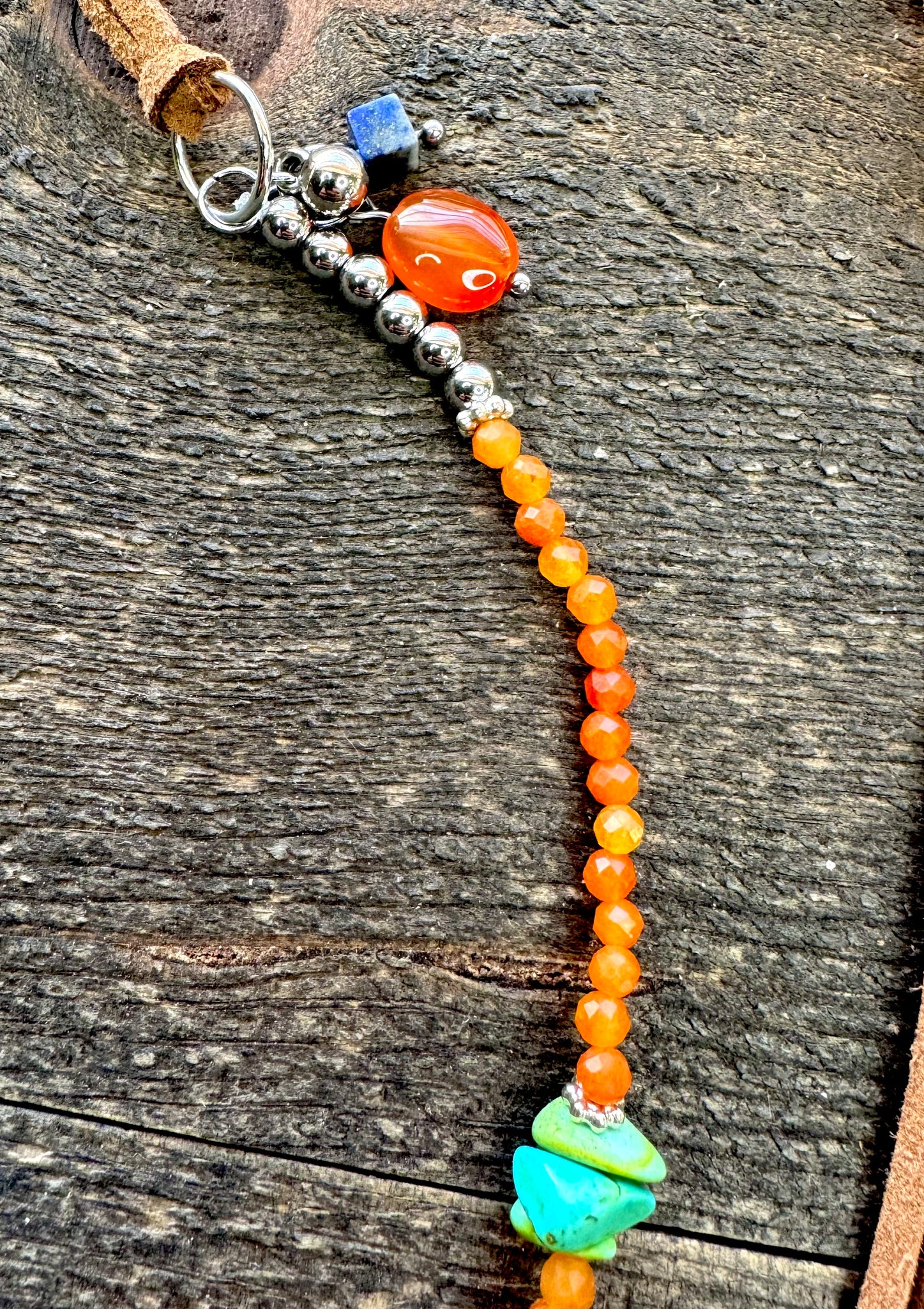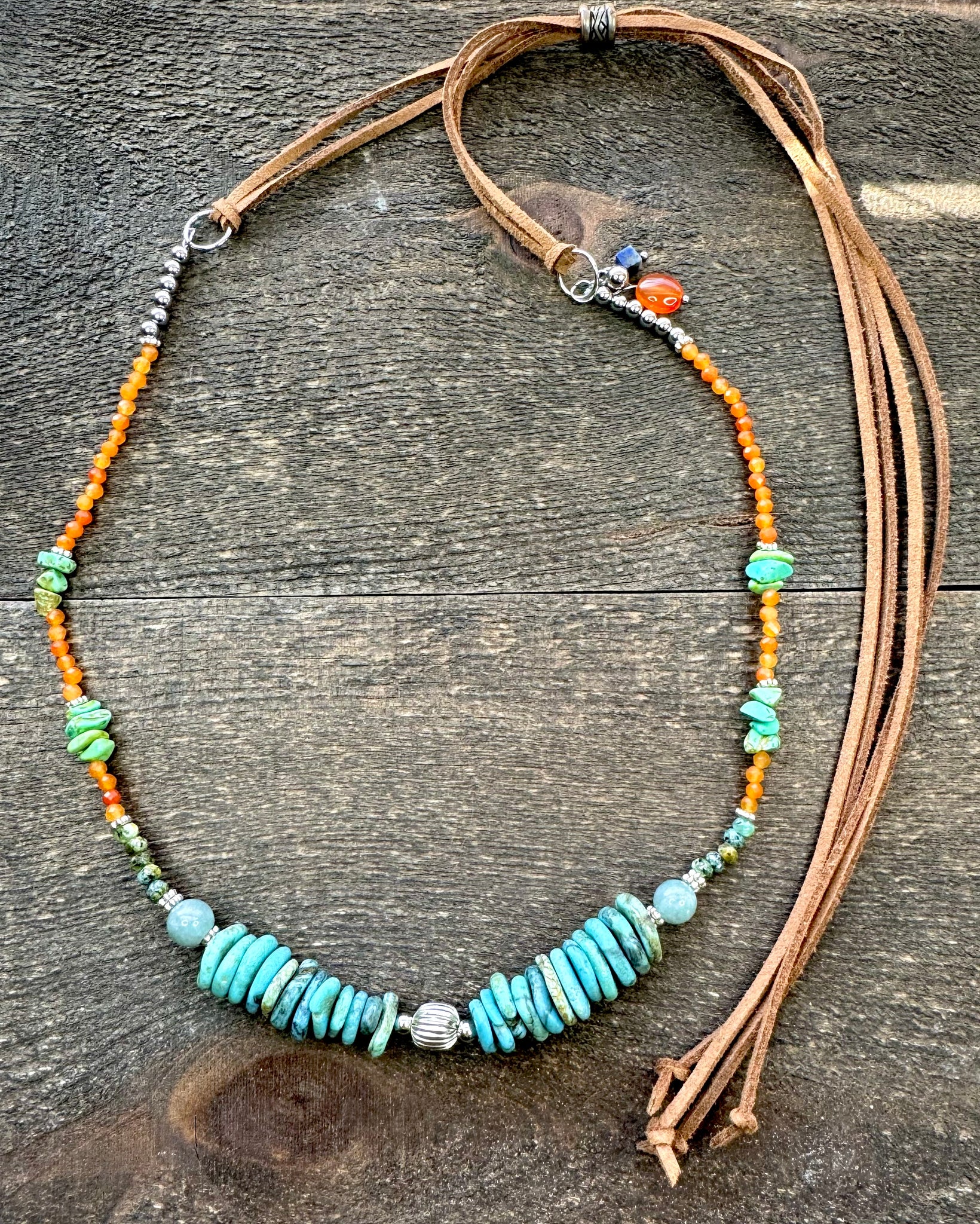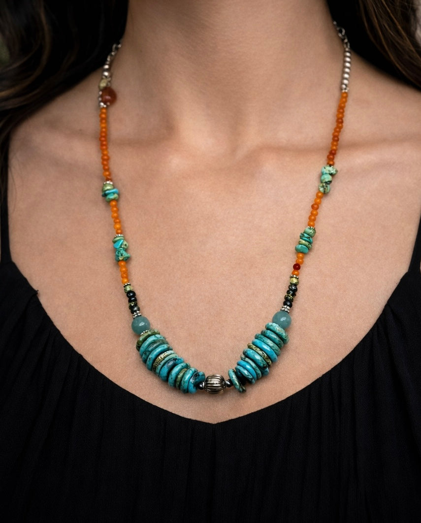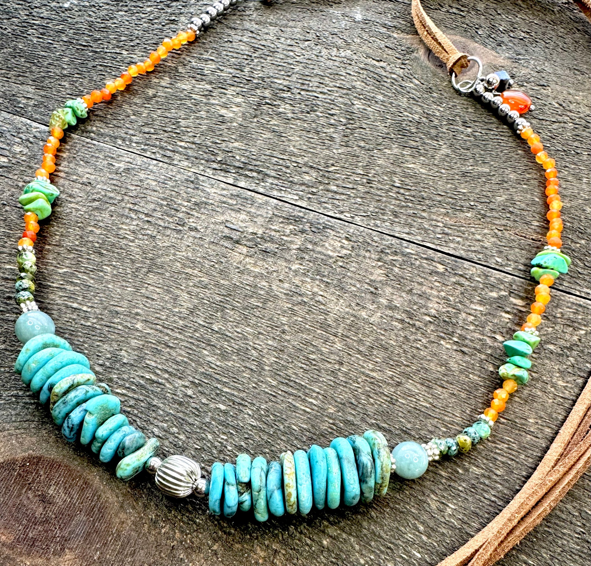 It’s made with Turquoise discs, Turquoise chip stones, a base of Carnelian agate and silver accents that tie the whole piece together.
