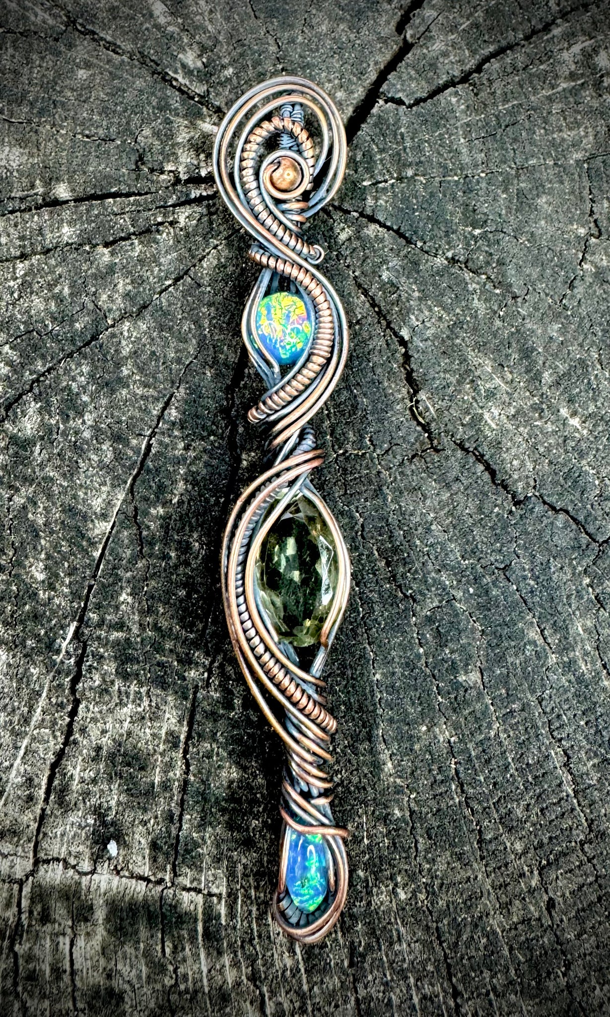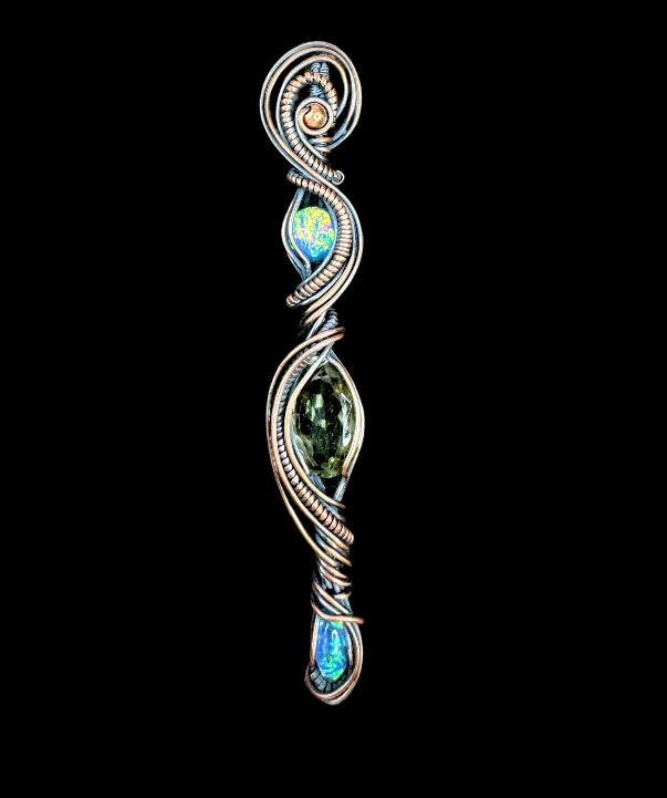 This pendant includes 3 gemstones in a longer stick design wire wrapped pendant. Keeping the gemstones as the focal, the wire flows around the gemstones with a flow and elegance.