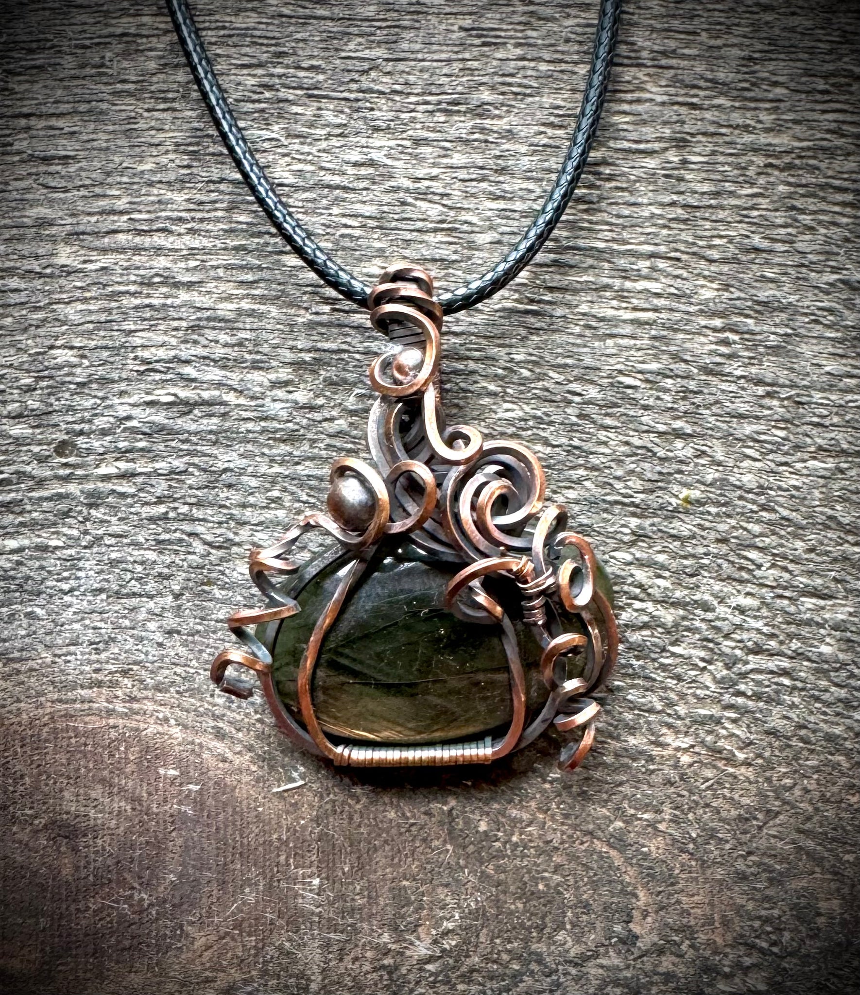 Pendant is made with bare copper, put through an oxidation process, polished and then sealed for extra protection from the elements and yourself.